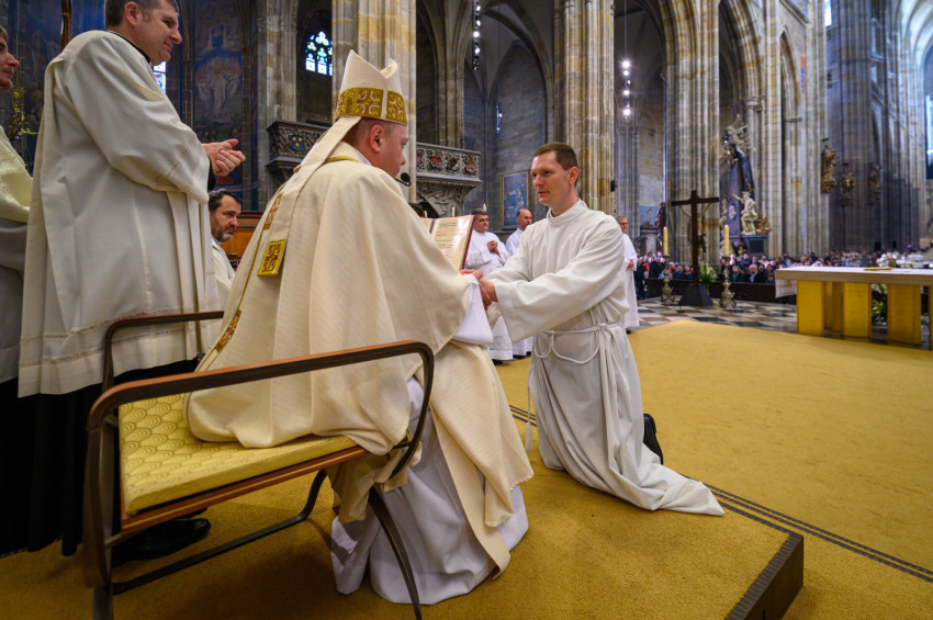 A hároméves formáció végeztével közös lelkigyakorlaton készültek a jelöltek arra, hogy a papi rend legalsó fokozatára szenteljék őket. A szombati szentmise előtt a szentelésre készülők a cseh egyház szívében, a Szent Vencel-kápolnában a szentelő püspök, Zdeněk Wasserbauer előtt tették le esküiket, melyeket az oltáron írtak alá.